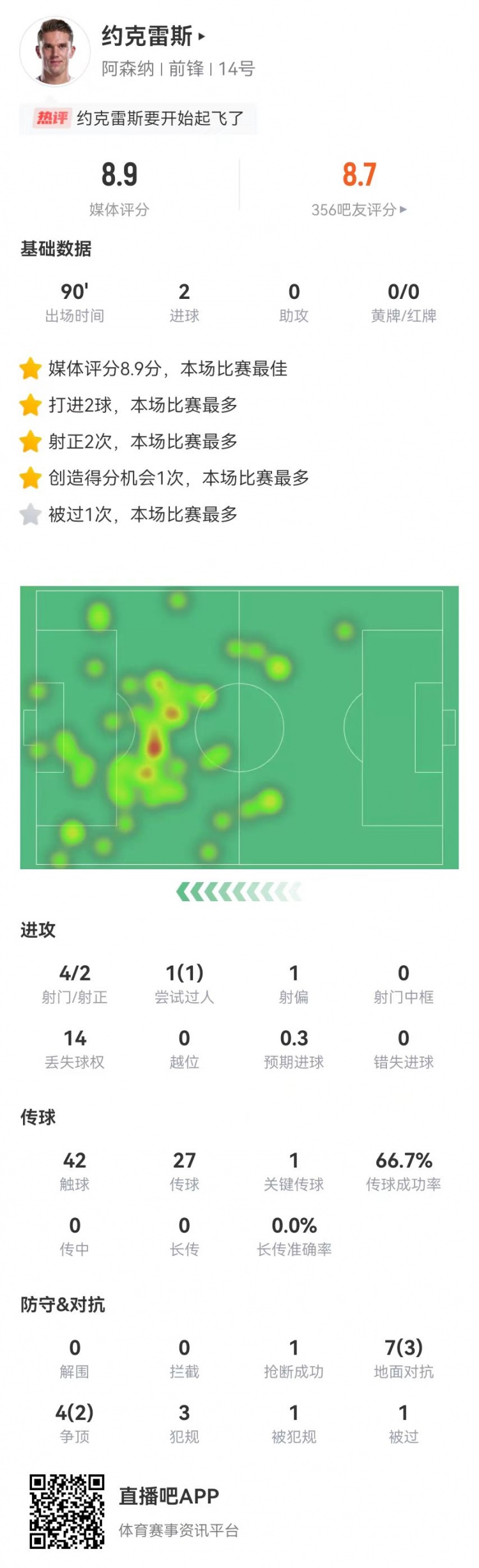 2月23日讯 阿森纳在本轮英超对阵热刺,约克雷斯本场数据如下: