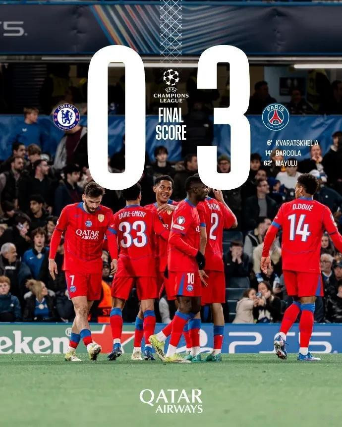 巴黎圣日耳曼制造本轮最大惨案,客场应战 3-0完胜切尔西,总比分8-2横扫对手。克瓦拉茨赫利亚开场闪击破门,巴尔科拉、马尤鲁接连建功,蝉联第一名 第一名 用流畅攻击 与高效终结,彻底撕碎蓝军防线。